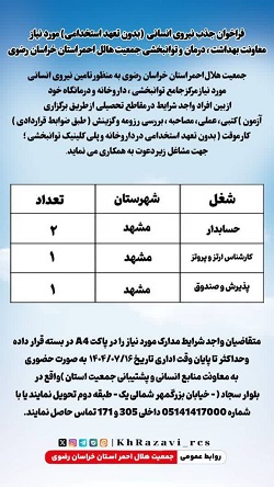 فراخوان جذب نیروی انسانی ( بدون تعهد استخدامی) مورد نیاز معاونت بهداشت ، درمان و توانبخشی جمعیت هلال احمر استان خراسان رضوی