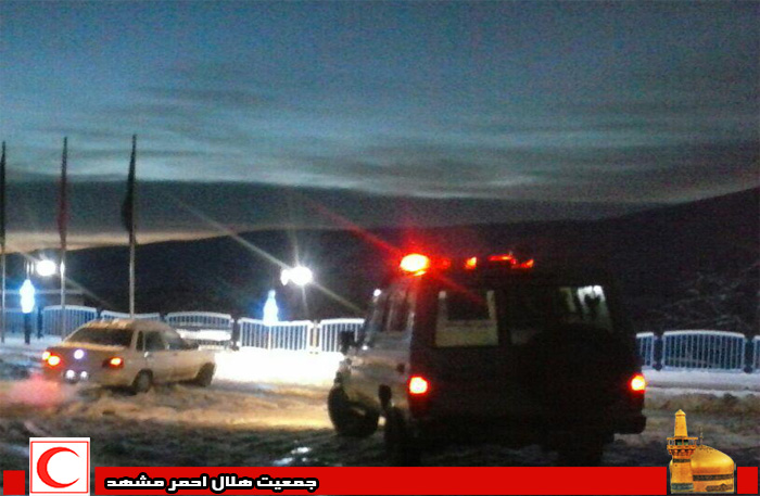 امداد رسانی عوامل امدادی جمعیت هلال احمر مشهد به خودروی حامل زن باردار گرفتار شده در برف