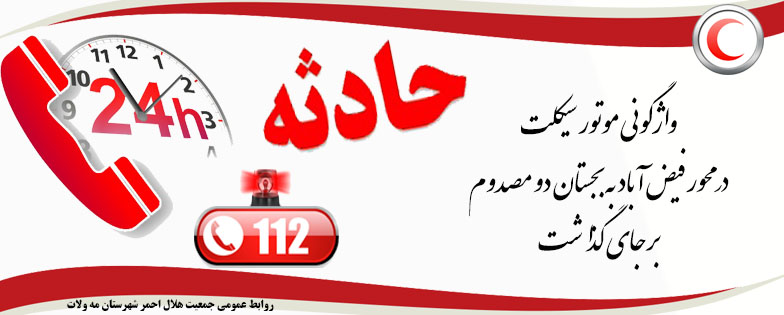 رئیس جمعیت هلال احمر مه ولات از امداد رسانی به حادثه واژگونی موتور سیکلت در کیلومتر ۲۰محور فیض آباد به بجستان خبر داد .
