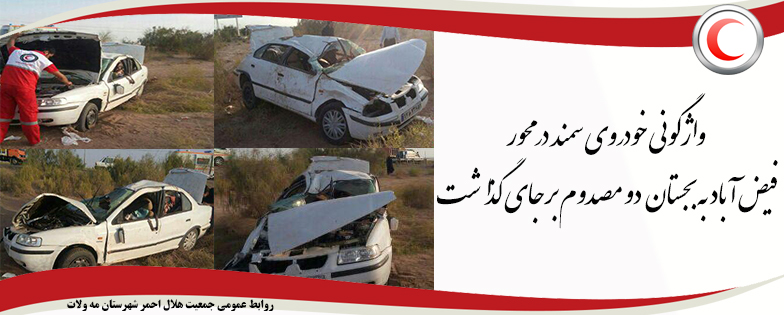 رئیس جمعیت هلال احمر مه ولات اعلام کرد : واژگونی یک دستگاه خودرو سمند در محور فیض آباد به بجستان دو مصدوم برجای گذاشت .