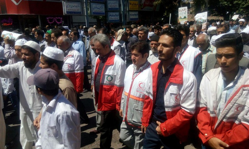 حضور اعضای جمعيت هلال احمر گناباد در راهپيمايي روز قدس و پوشش امدادی مراسم