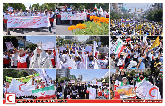 همزمان با آخرین جمعه از ماه مبارک رمضان و روز جهانی قدس، جمعی از نیروهای هلال احمرخراسان رضوی در شهر مشهد وسایر شهرهای استانی با حضور در راهپیمایی روز جهانی قدس یک بار دیگر وحدت و انسجام خود را با آحاد مردم همیشه در صحنه کشورمان به نمایش گذاشتند.