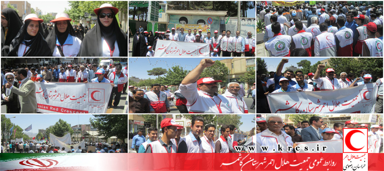 کارکنان و اعضای جمعیت هلال احمر شهرستان سرخس همگام با مردم سراسر کشور ایران اسلامی در راهپیمایی با شکوه روز قدس شرکت کردند
