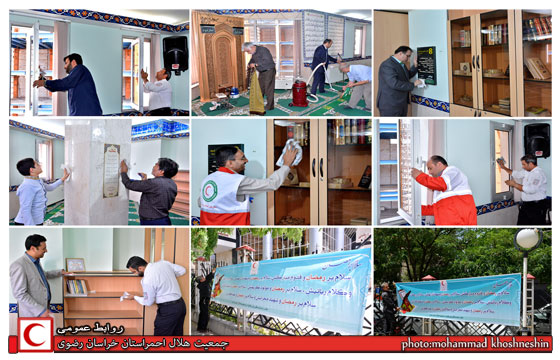همزمان با دهه گرامیداشت وبهداشت مساجد و در استقبال از ماه مهمانی خدا ظهر امروز دوشنبه،نمازخانه ساختمان صلح جمعیت هلال احمر استان ونیز شعبه های هلال احمر در خراسان رضوی،غبار روبی وعطر افشانی شد.