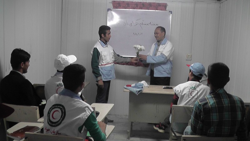 اهدای گل اعضا کانون های دانش آموزی به معلم و مربی داوطلب هلال احمر در مدرسه