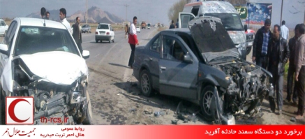 روابط عمومی جمعیت هلال احمر تربت حیدریه از امدادرسانی به حادثه برخورد دو دستگاه سمند در18کیلومتری محور تربت حیدریه به دولت آباد خبر داد