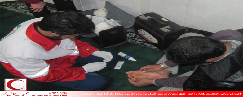 امدادرسانی جمعیت هلال احمر شهرستان تربت حیدریه به زائرین پیاده بارگاه منور رضوی در قالب طرح همسفران خورشید