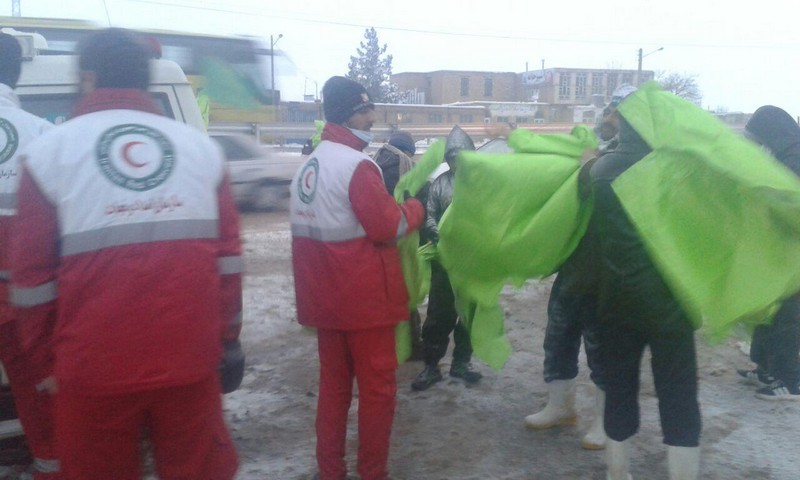 جمعیت هلال احمر تربت جام 700 عدد کاور بارانی بین زائرین پیاده حرم حضرت علی بن موسی الرضا (ع) توزیع نمود
