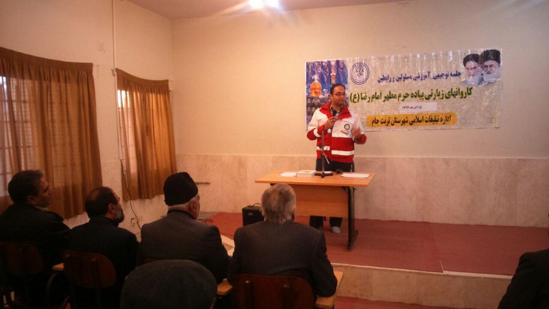 جلسه توجيهي آموزشي مسئولين و رابطين كاروان هاي زيارتي پياده حرم مطهر امام رضا (ع) در محل سازمان تبليغات اسلامي تربت جام با حضور نماينده جمعيت هلال احمر تربت جام برگزار شد .