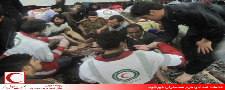 امدادگران و داوطلبان جمعیت هلال احمر در قالب طرح بزرگ همسفران خورشید بصورت داوطلبانه در طول مسیر با ورود اولین کاروانهای پیاده حضرت علی ابن موسی الرضا به این زائران خدمات امدادی را آغاز کردند