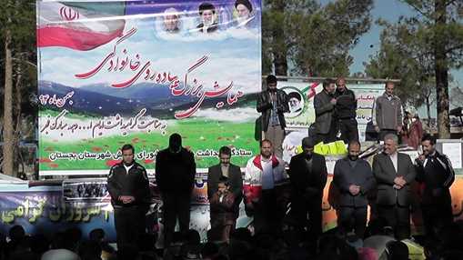 حضورکلیه مسئولین شهرستان برگزارگردیدکه دراین همایش پرسنل وتعدادی ازاعضای جوانان  امدادگر-داوطلبان خواهرو.برادرحضورداشتند.به گزارش روابط عمومی جمعیت هلال احمرمراسم بزرگ همایش پیاده روی با