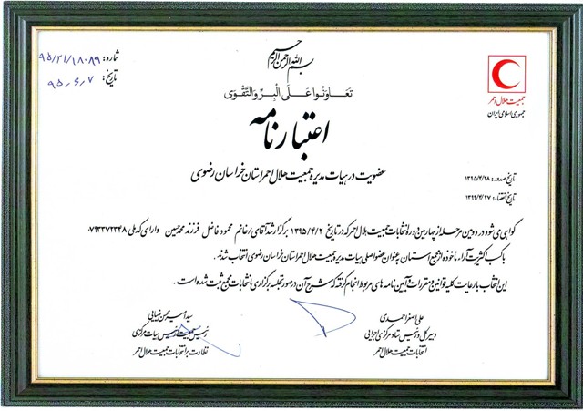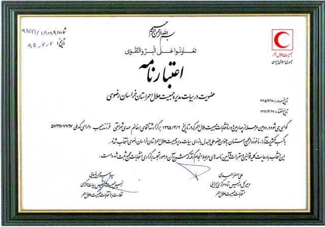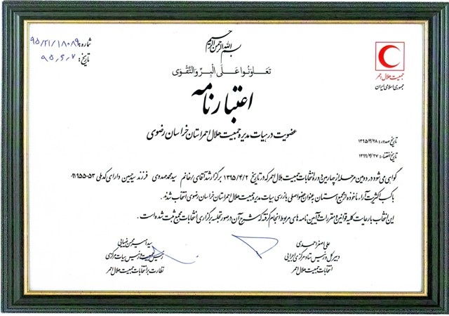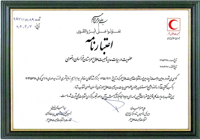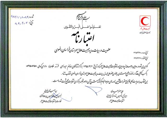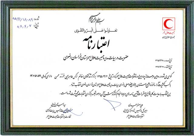 اعتبارنامه عضویت در هیات مدیره هلال احمر خراسان رضوی