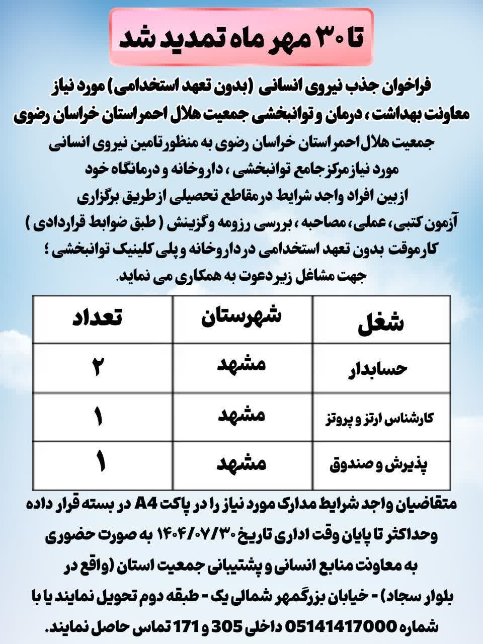 فراخوان جذب نیروی انسانی مورد نیاز معاونت بهداشت،درمان و توانبخشی جمعیت هلال احمر خراسان رضوی